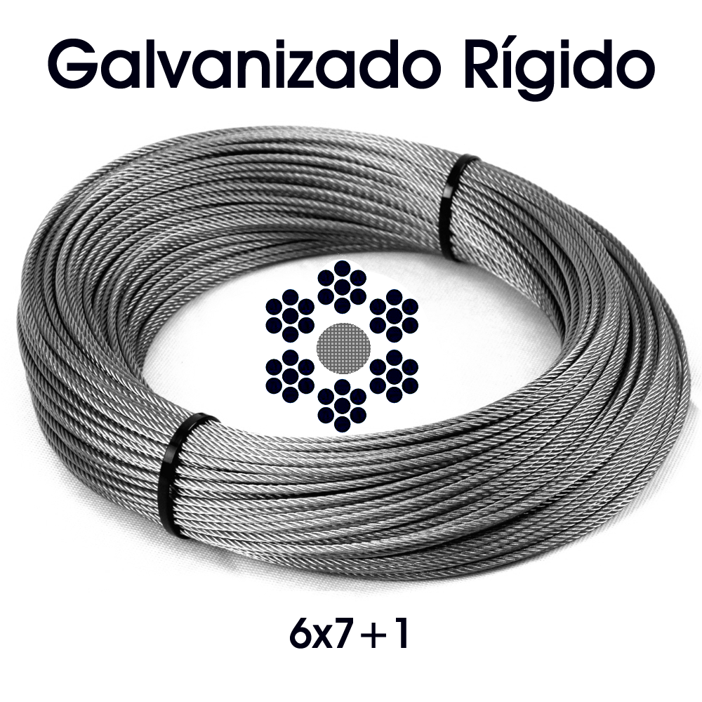 Este cable de acero galvanizado rígido es ideal para aplicaciones que requieren alta resistencia, durabilidad y seguridad. Con una construcción 6x7+1, está compuesto por 6 torones de 7 hilos más un alma central, lo que le otorga mayor rigidez y una excelente capacidad de carga.